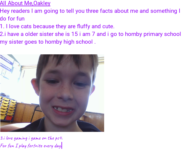 I am a student in the Uru MÄnuka Cluster. I am a Year 5 and my teacher is Miss Scott. This is a place where I will share my learning. Please note that some of it will not be complete, it will be my first drafts. Remember to be positive, thoughtful and helpful in your comments.